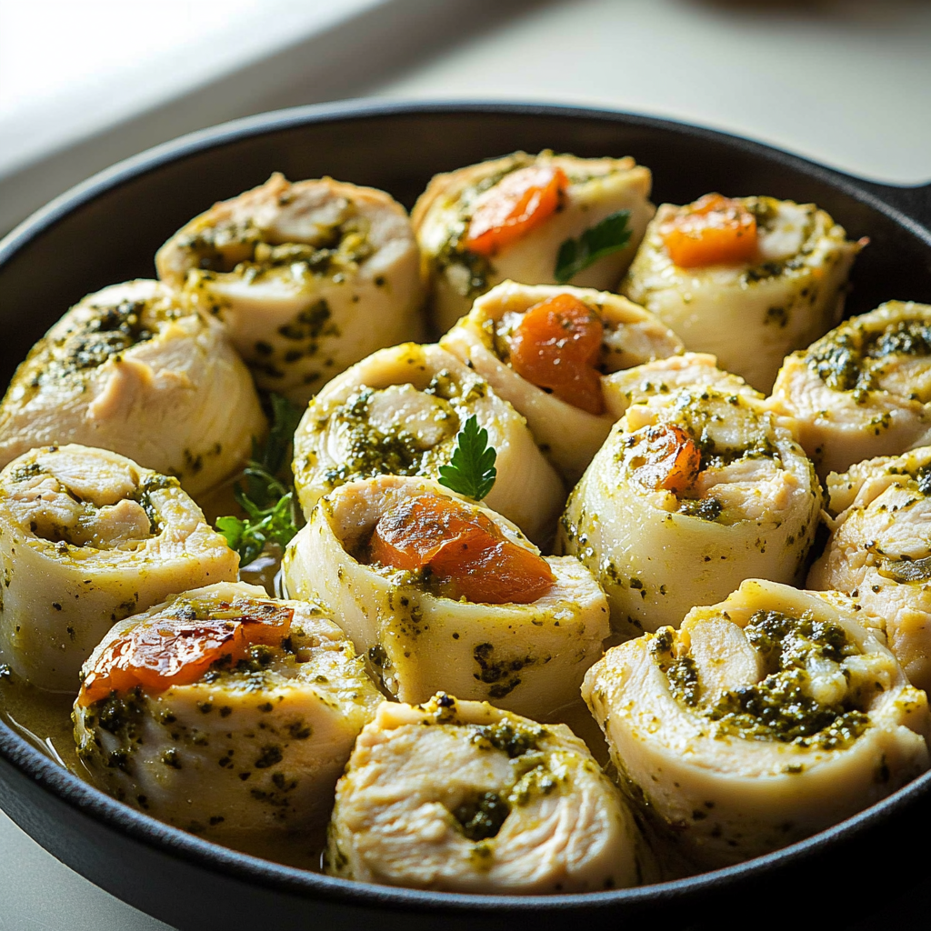 Chicken Pesto Roll Ups are a delightful dish featuring thinly sliced cooked chicken wrapped in tortillas or flatbreads with pesto sauce, cheese, and various vegetables. They are versatile and can be served as an appetizer, snack, or even part of a main meal. The combination of tender chicken with aromatic pesto creates a burst of flavor in every bite. You can customize them according to your taste preferences by adding different fillings such as sun-dried tomatoes or roasted red peppers. These roll-ups are easy to prepare and perfect for gatherings or quick lunches.