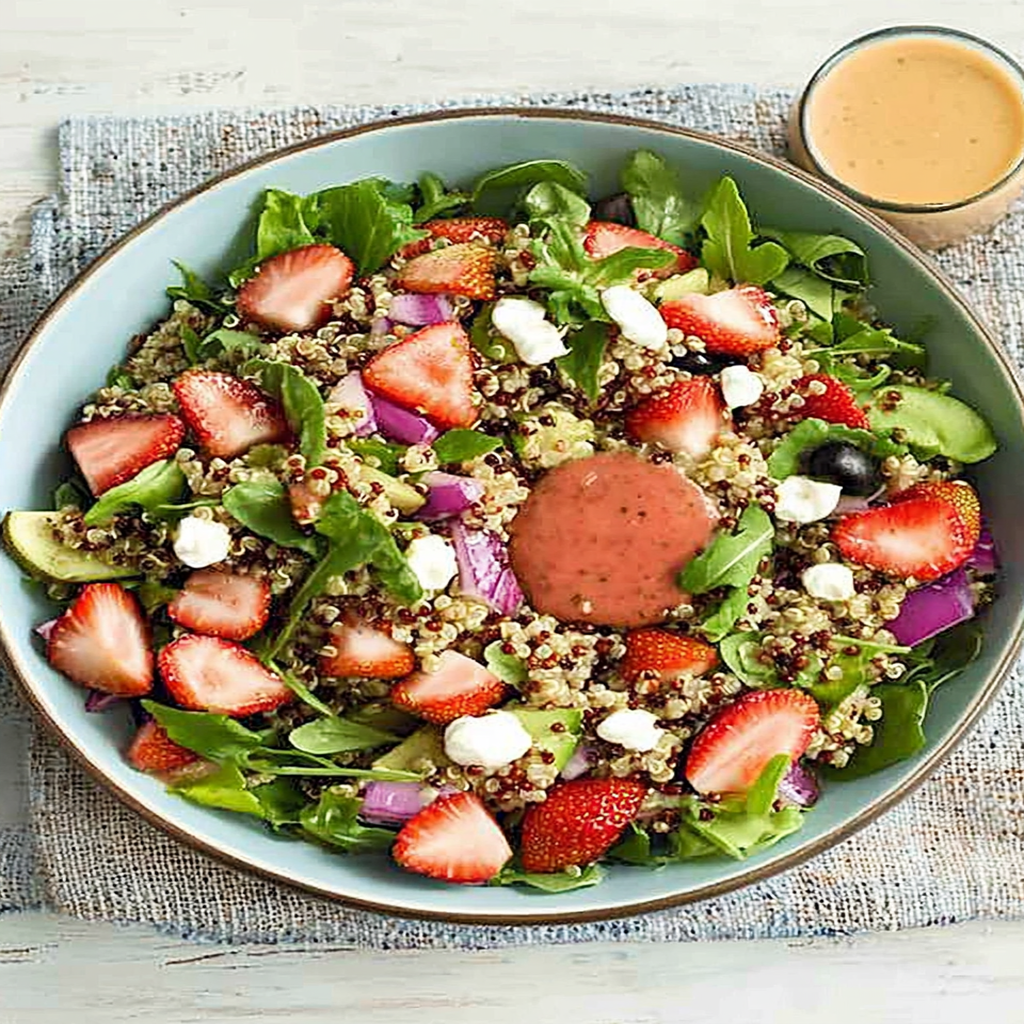 Quinoa Salad with Strawberry Vinaigrette Dressing is an excellent choice for a healthy meal packed with flavor. By combining fresh ingredients like strawberries and mixed greens, this salad provides essential nutrients while being visually appealing. The homemade strawberry vinaigrette adds a sweet touch that enhances every bite. Whether served as a side dish or a main course, this salad is sure to impress your family and friends with its vibrant taste and simple preparation. Enjoy experimenting with different ingredients to make it uniquely yours!