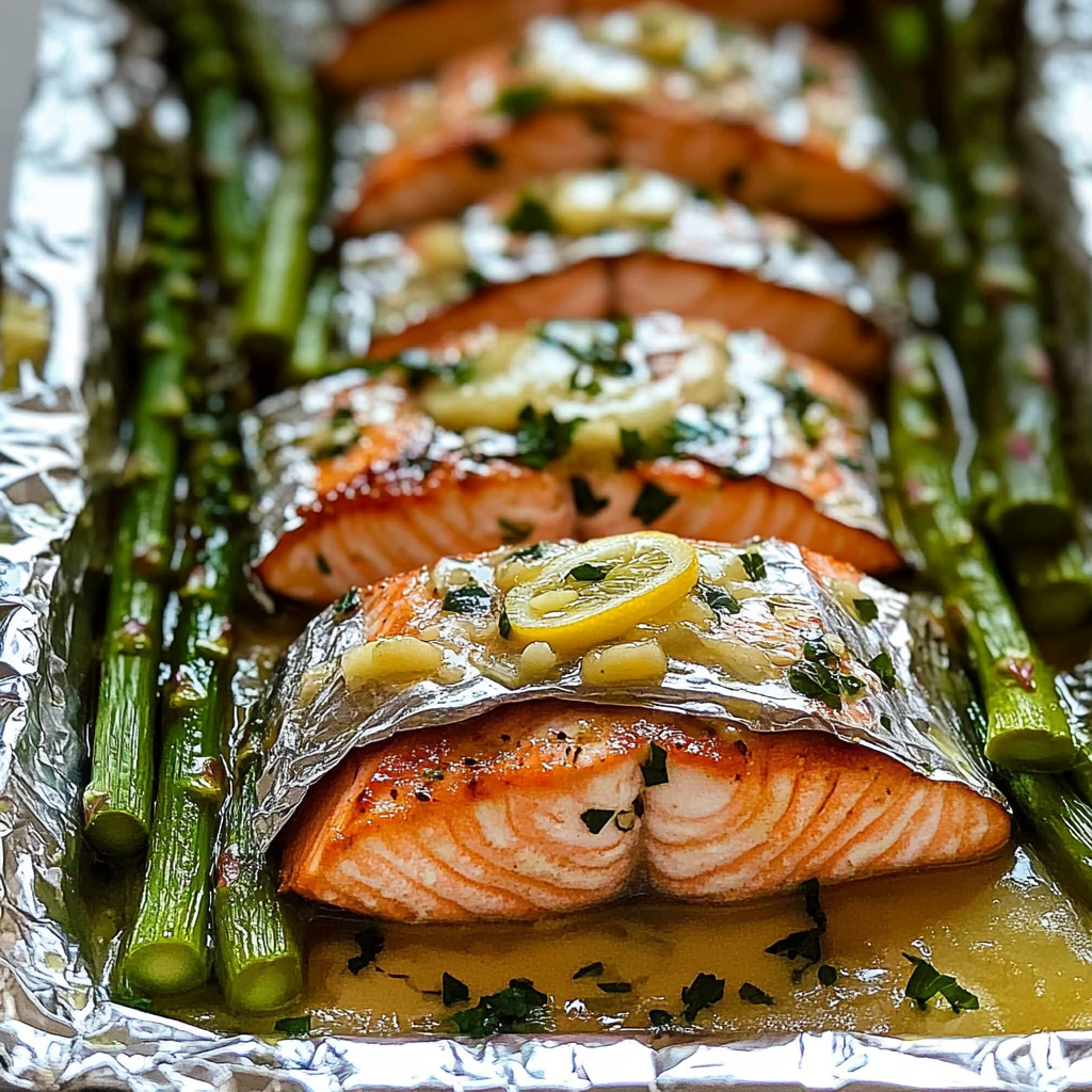 Baked Salmon in Foil with Asparagus and Lemon Garlic Butter Sauce